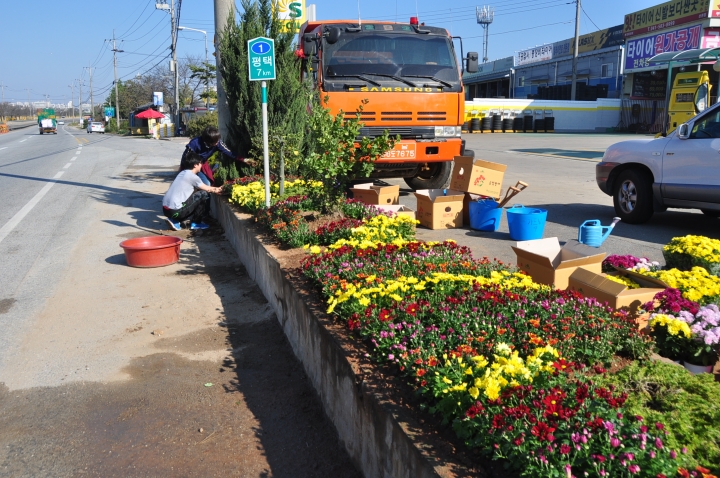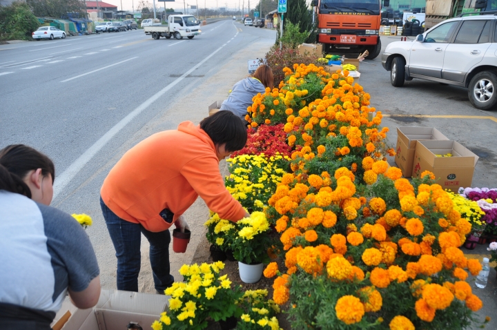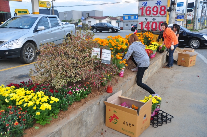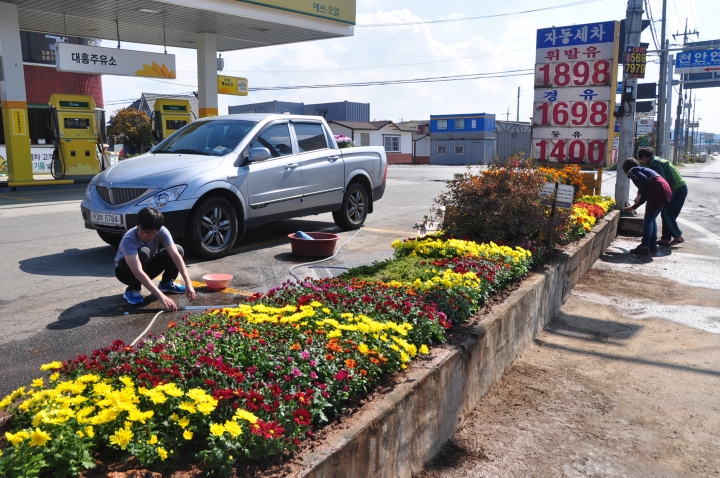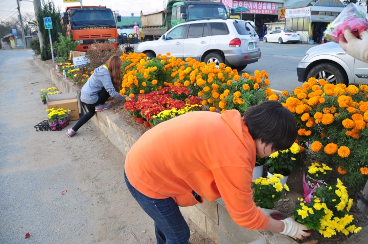 학교에서 지원하는 창직동아리인 '연암게릴라가드닝' 학생들이 학교에서 나가는 길과 1번 국도 모퉁이에 있는 대홍주유소의 거의 방치된 플랜터에 국화를 심었습니다(2013.10.19).